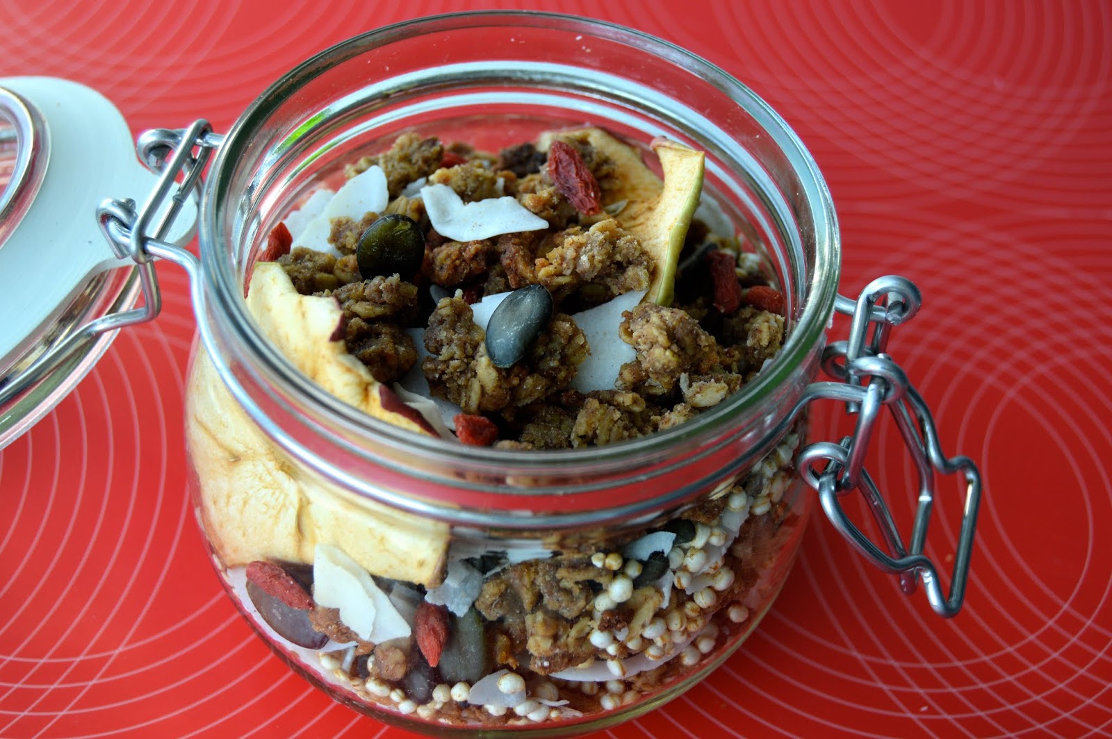 Tenía fresas, el "cacaolat" y me ha dado por improvisar unos mueslis. Lo importante entender cómo hacerlos y ha tirar de lo que tengas por al cocina.